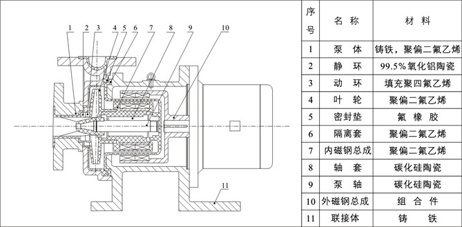 驅動裝置采用主動磁鐵聯軸器直接裝在電機軸上,泵室完全封閉,通過磁力偶合間接驅動泵軸上帶磁鐵的葉輪旋轉結構緊湊、安全節能。堅固耐用的泵體結構雖然接觸液體部分是氟塑料,但泵外殼是金屬材料,故泵體足以承受管道的重量及抵受機械性沖擊。氟塑料磁力泵由泵、磁力傳動器、電動機三部分組成。關鍵部件磁力傳動器由外磁轉子、內磁轉子及不導磁的隔離套組成。當電動機帶動外磁轉子旋轉時,磁場能穿透空氣隙和非磁性物質,帶動與葉輪相連的內磁轉子作同步旋轉,實現動力的無接觸傳遞,將動密封轉化為靜密封。由于軸、內磁轉子被泵體、隔離套完全封閉,從而徹底解決了“跑、冒、滴、漏”問題,消除了煉油化工行業易燃、易爆、有毒、有害介質通過泵密封泄漏的安全隱患,有力地保證了職工的身心健康和安全生產。