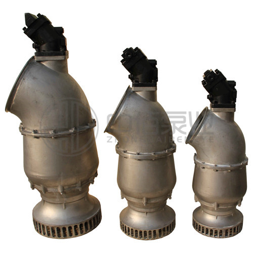 高效便攜式液壓驅動斜出水潛水斜流泵;屬于應急搶險液壓驅動潛水泵,其特征在于所述斜出水上桶體為自垂直方向60度傾斜,具有流量大,效率高,結構緊湊、體積小、重量輕,可便攜使用,具有便攜式的特殊功能(一般15KW功率根據公式換算過來的重量也就在30公斤以內,一個人都能提的動)等特點,適用于各種易燃易爆場合,抗洪搶險、排澇、消防、灌溉等各種特殊場合。液壓驅動馬達外上置結構,便于拆裝、維修更換馬達,且內過水阻力小;快裝出水接頭可與外用消防水帶迅速連接,具有現場快速應用的功能。