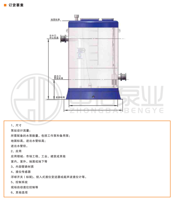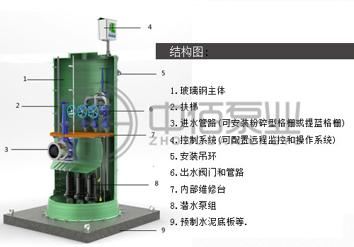 ZBWT型預制泵站是有潛水泵、泵站設備、除污格柵設備、控制系統及遠程監控系統組成的一體化的設備。泵站建設周期極短,安裝簡便,質量可靠,工程施工量少,占地面積少,自動化程度高,是傳統混凝土泵站的最佳替代品,集成度高,容積優化是最顯著的特點。