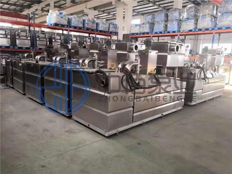 2、廢水在油水分離倉中,利用油水密度差原理,油污自動上浮到特制的集油裝置中,集油裝置頂部設置的放油閥與廢油收集桶連接,浮油在集油裝置中儲存達到一定高度時,打開放油閥,浮油自行流入設備旁邊放置的廢油收集桶中。油水分離倉中可選配全自動微氣泡發生器,加快油水分離速度,有利于油水充分分離。油水分離倉配有專用電加熱恒溫裝置,使油脂在較低溫度環境下不會發生板結。收集的廢油定期轉移至允許傾倒的地方。油水分離倉內的液位達到一定高度時,污水在壓力作用下通過回流管流入污水提升倉。