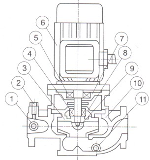 7、聯體座 8、泵蓋 9、葉輪螺母 10、泵體 11、放水閥